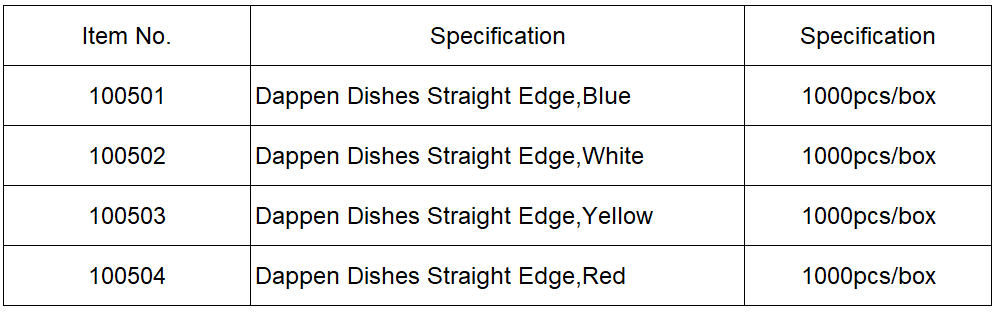 Disposable with straight edges and available in 4 colors: white, yellow, blue and red.